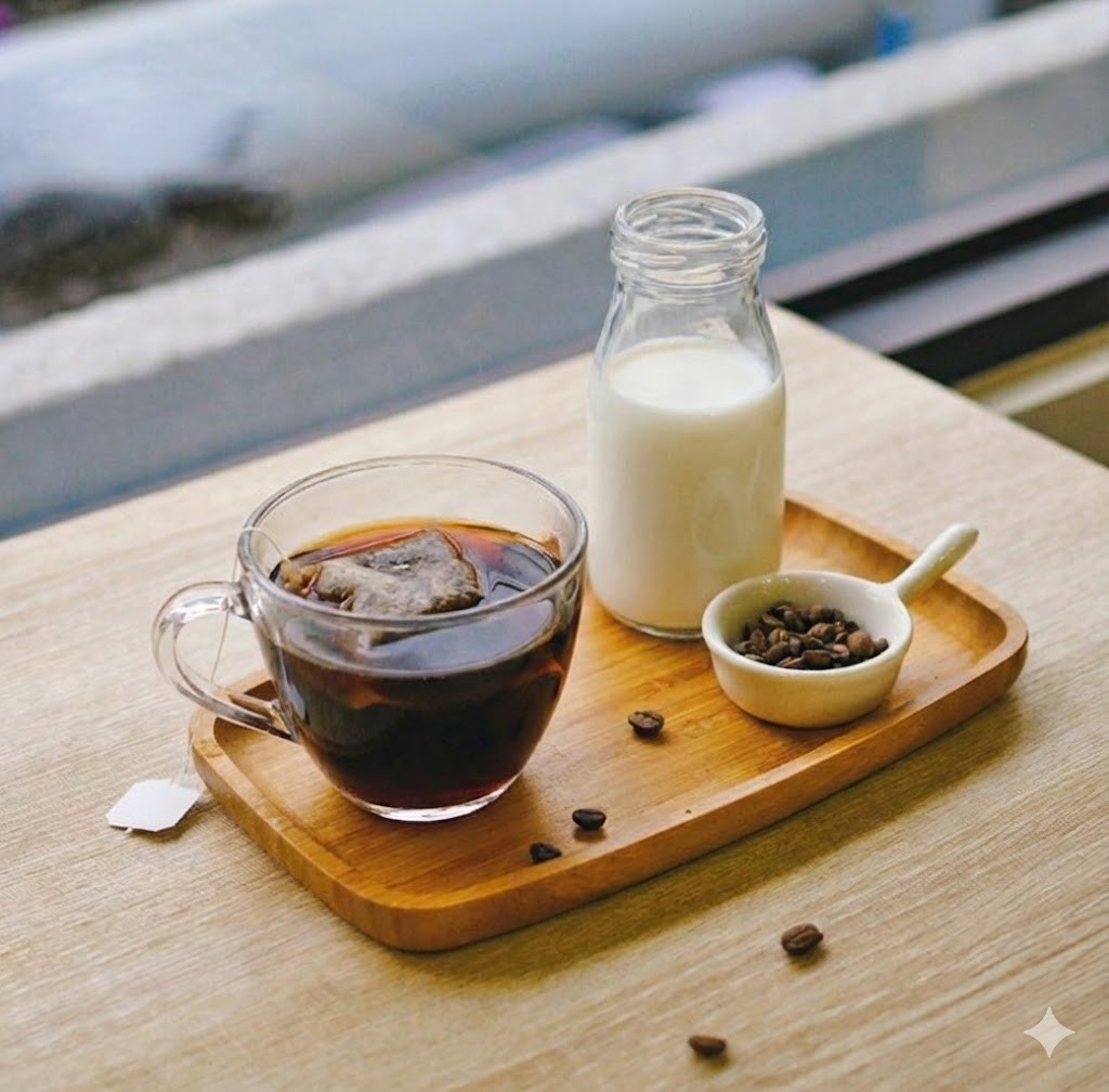 - 將咖啡濾泡包放入乾淨的容器中,注入冰牛奶或熱牛奶